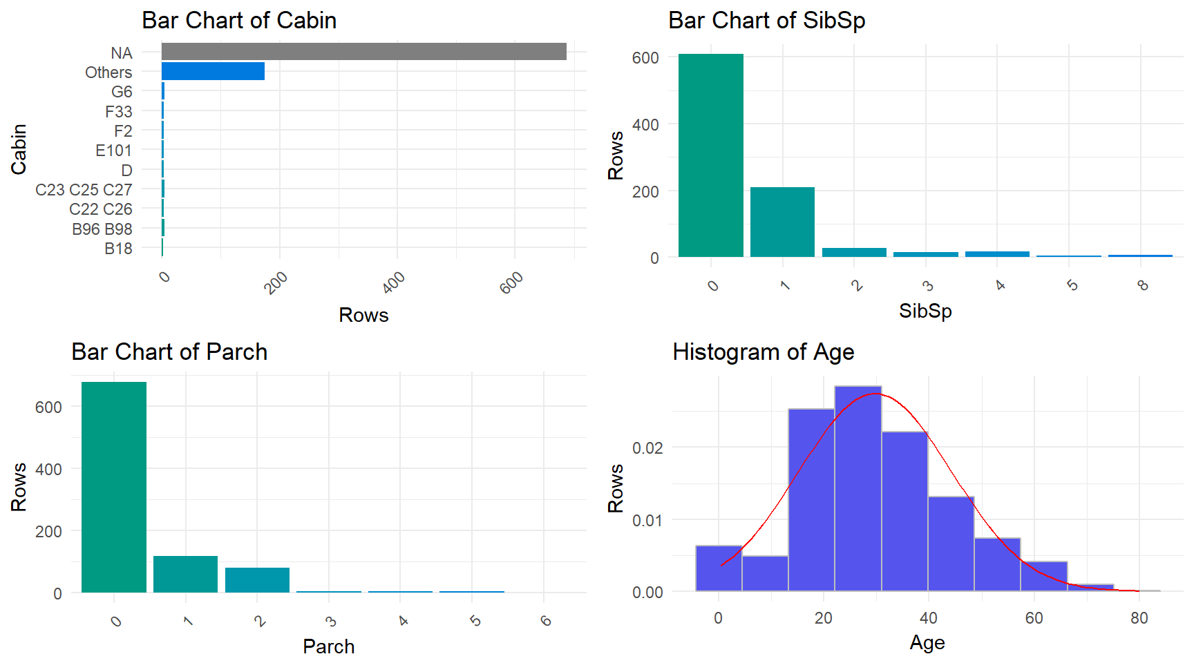 For the bar plots, the axis labeled as “Rows” is actually the number of observations of each variable category. For the histograms, the number of observations has been scaled for the associated density plot.
